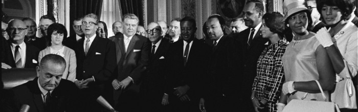 Fifty years ago today, President Lyndon Johnson signed the Voting Rights Act, which many consider the most important civil rights legislation of the 1960s. The law gave the federal government oversight responsibility over elections in all or part of 15 states (including parts of New York, Michigan, and California) where there had been systemic exclusion of voters based on race, ethnicity, or economic status. Under the Voting Rights Act, states had to pre-clear any changes to voter eligibility rules or election conduct prior to implementing these changes.